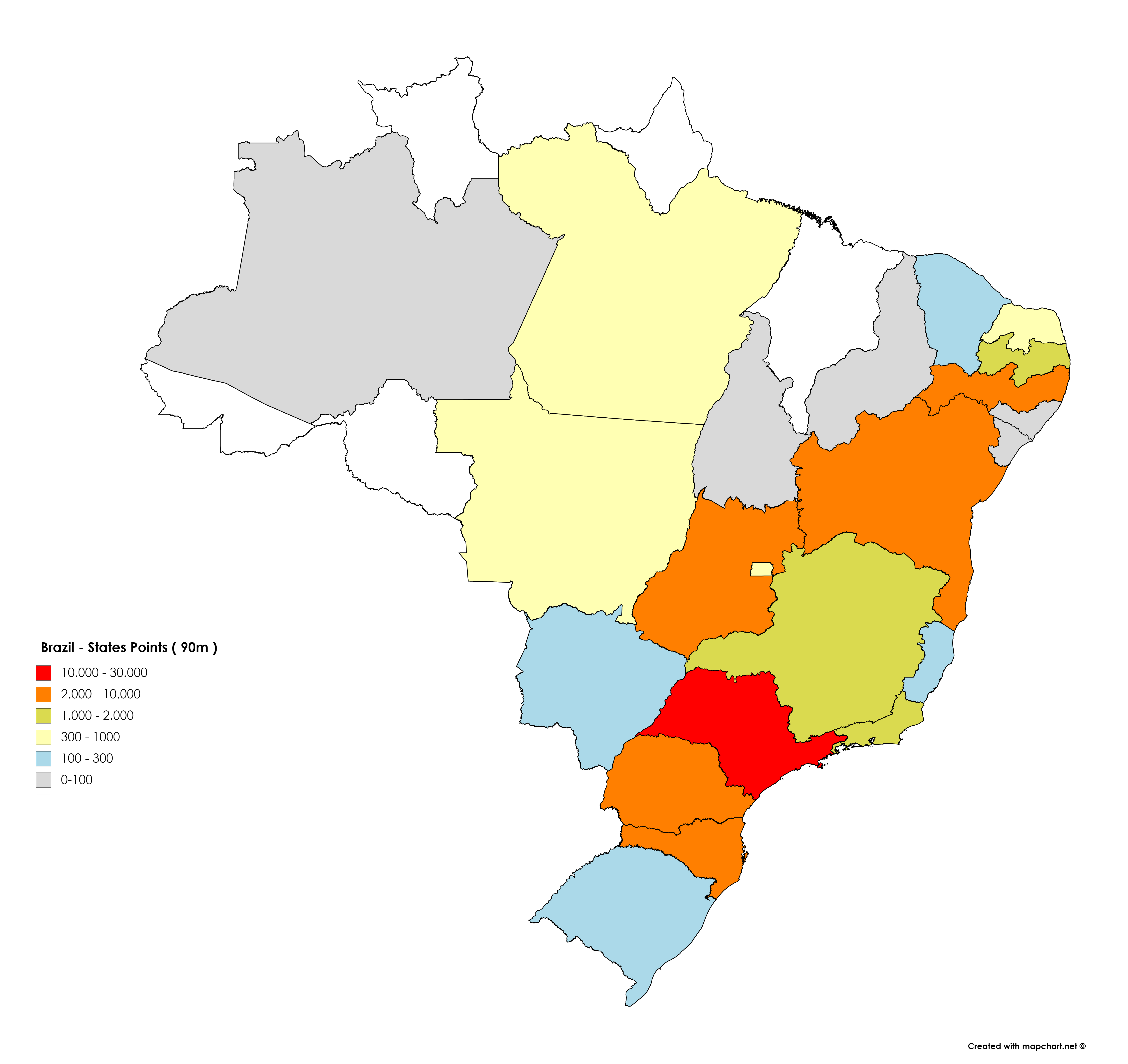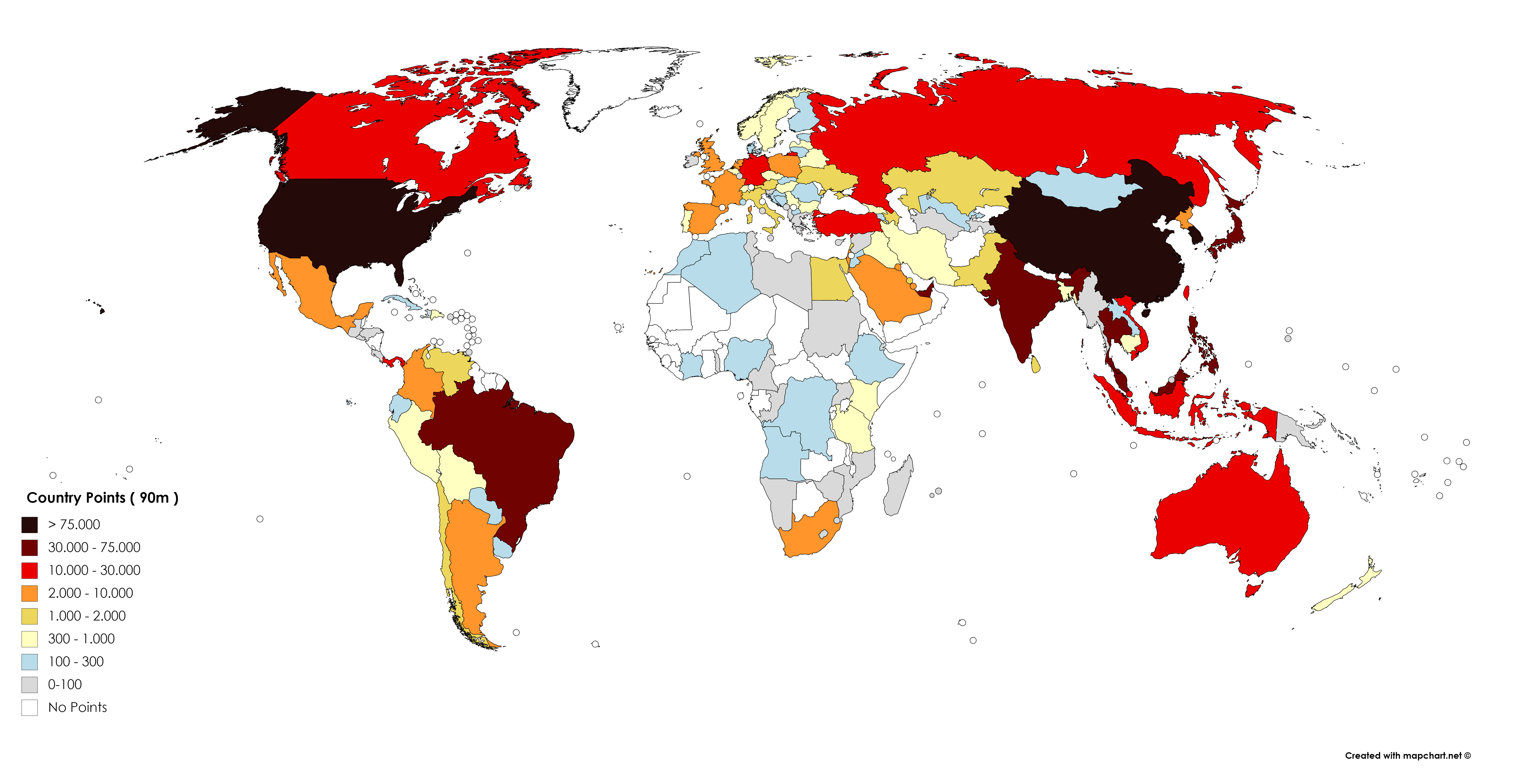 After this there are colored maps of world countries, and states / provinces maps of some world large and high scoring countries (U.S.A., Canada, Brazil, China, India, Australia). Legends are inside each one and all use the same reference colors for easier comparison.